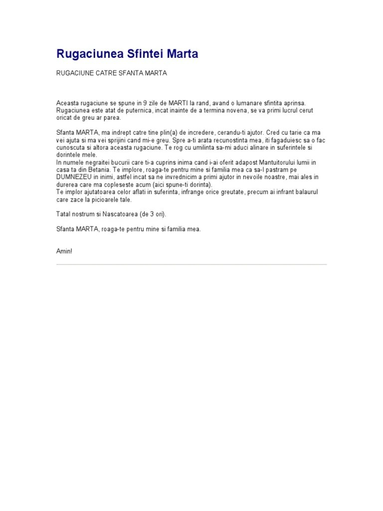 Aceasta rugaciune se spune in 9 zile de marti la rand, avand o lumanare sfintita aprinsa. 08.09.2015 · rugaciune catre sfanta marta. Rugaciunea este atat de puternica, incat inainte de a termina novena, se va primi lucrul cerut oricat de greu ar parea. Sfanta marta, ma indrept catre … Mai puțin cunoscută, sfânta marta se numără printre făcătorii de minuni și printre sfinții care împlinesc dorințe... Sfanta marta, ma indrept catre …