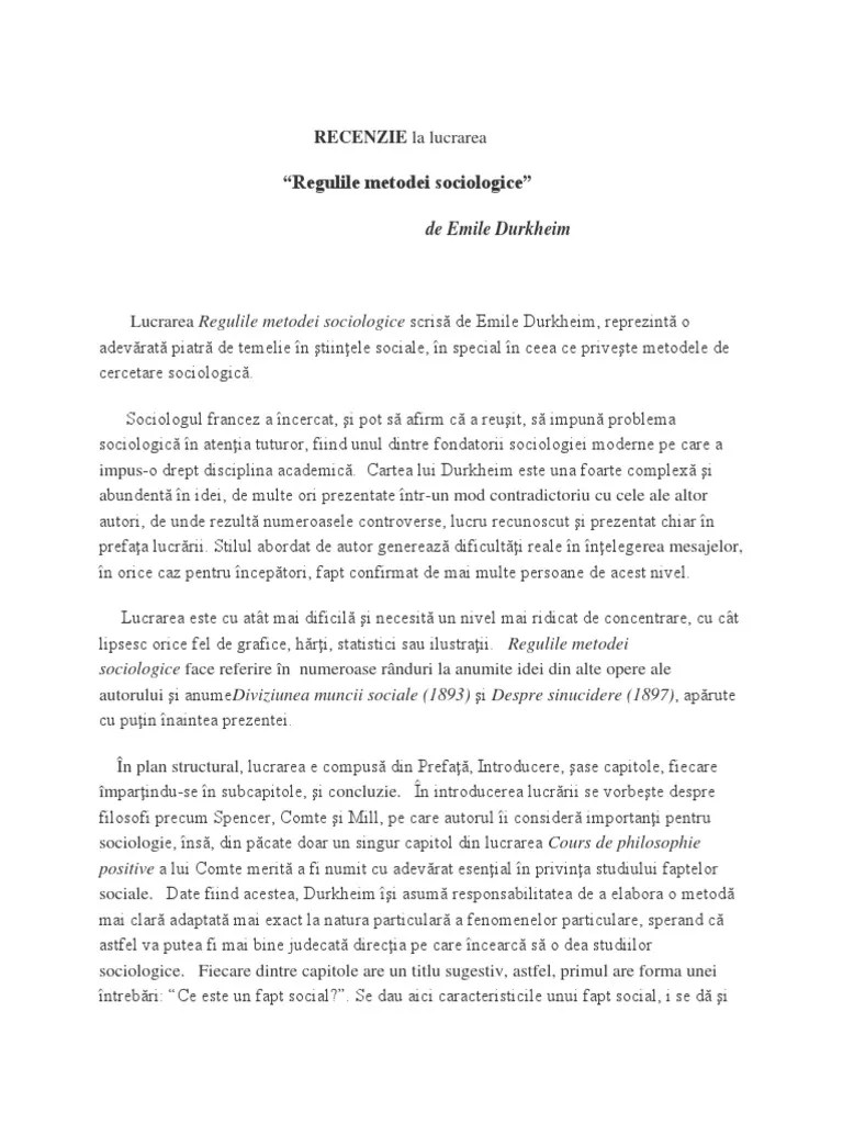 Apăsați pentru a extinde informațiile documentului.. Lucrarea regulile metodei sociologice scrisă de emile durkheim, reprezintă o adevărată piatră de temelie în ştiinţele sociale, în special în ceea ce priveşte metodele de cercetare sociologică. Sociologul francez a încercat, şi pot să afirm că a reuşit, să impună.. Am ramas datoare cu cel putin o recenzie la o carte si anume suflete de sticla a psihologului gaspar gyorgy.