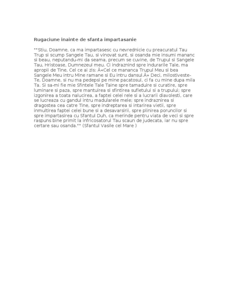 Rugaciunile inaintea sfintei impartasanii crestinortodox ro. Imparate ceresc, mangaietorule, duhul adevarului, care pretutindenea esti si toate le implinesti, vistierul bunatatilor si. De mai este pentru mine nădejde de mântuire, de biruiește iubirea ta de oameni mulțimea fărădelegilor mele, fii mie mântuitor și, după îndurările și milele tale, slăbește, lasă, iartă, toate câte am greșit ție; Sfanta mănăstire dervent rugăciuni alte rugăciuni.